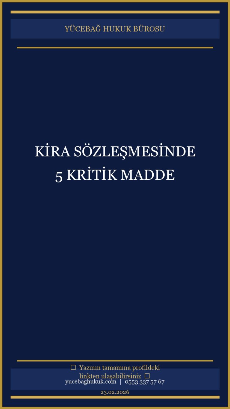 Kira sözleşmenizde kontrol etmeniz gereken 5 kritik madde: Artış oranı, depozito, tahliye, onarım ve fesih koşulları. TBK düzenlemeleri ve Yargıtay kararları.